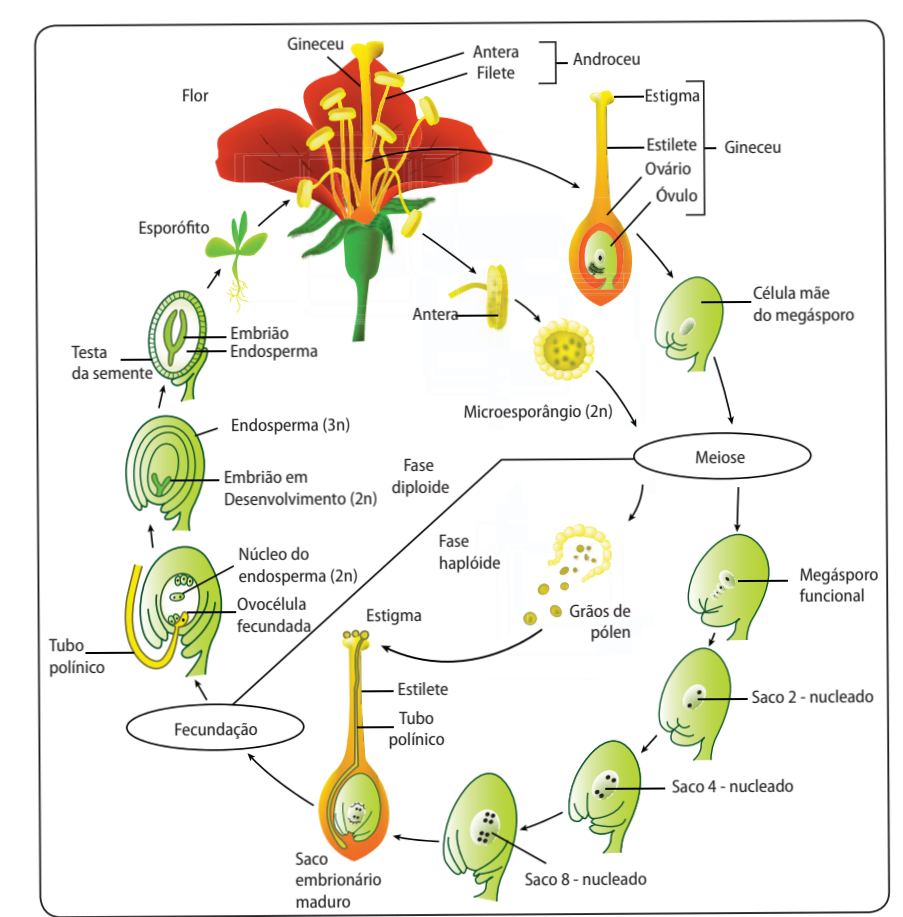 Dentro das flores, localizadas no esporófito, encontramos tanto os órgãos masculinos quanto femininos responsáveis pela reprodução sexual. Os órgãos masculinos, chamados estames, produzem grãos de pólen, que contém os gametófitos masculinos em desenvolvimento. Já os órgãos femininos, os carpelos, por sua vez, abrigam o ovário, onde se encontram os óvulos que contêm os gametófitos femininos.
