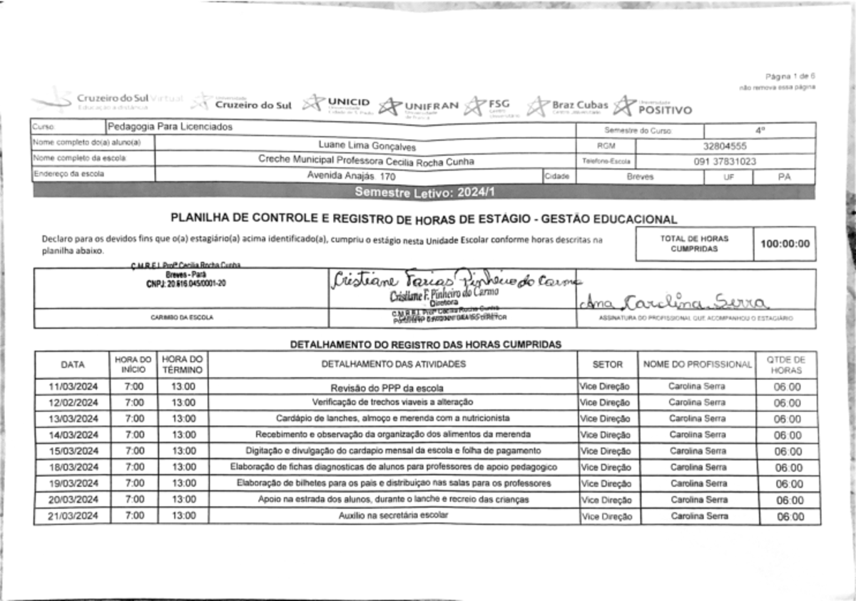 Atividades Desenvolvidas No Estágio De Gestão Escolar Planilha - NAZAEDU