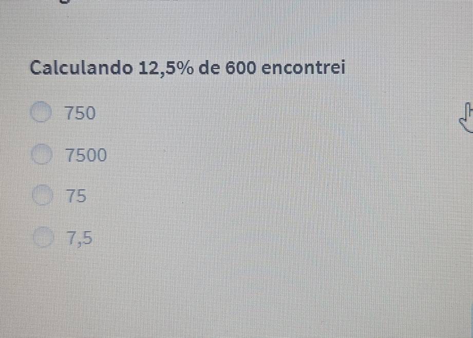 Resolvido:Calculando 12,5% de 600 encontrei 750 7500 75 7,5