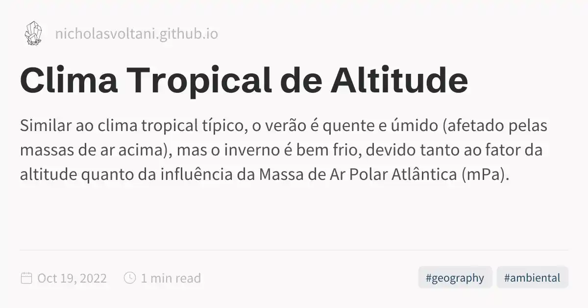 O clima tropical de altitude, também conhecido como clima montanhoso tropical, é um tipo de clima encontrado em regiões montanhosas de latitudes tropicais. Caracteriza-se por temperaturas amenas, pluviosidade abundante e grande variação climática em relação à altitude.