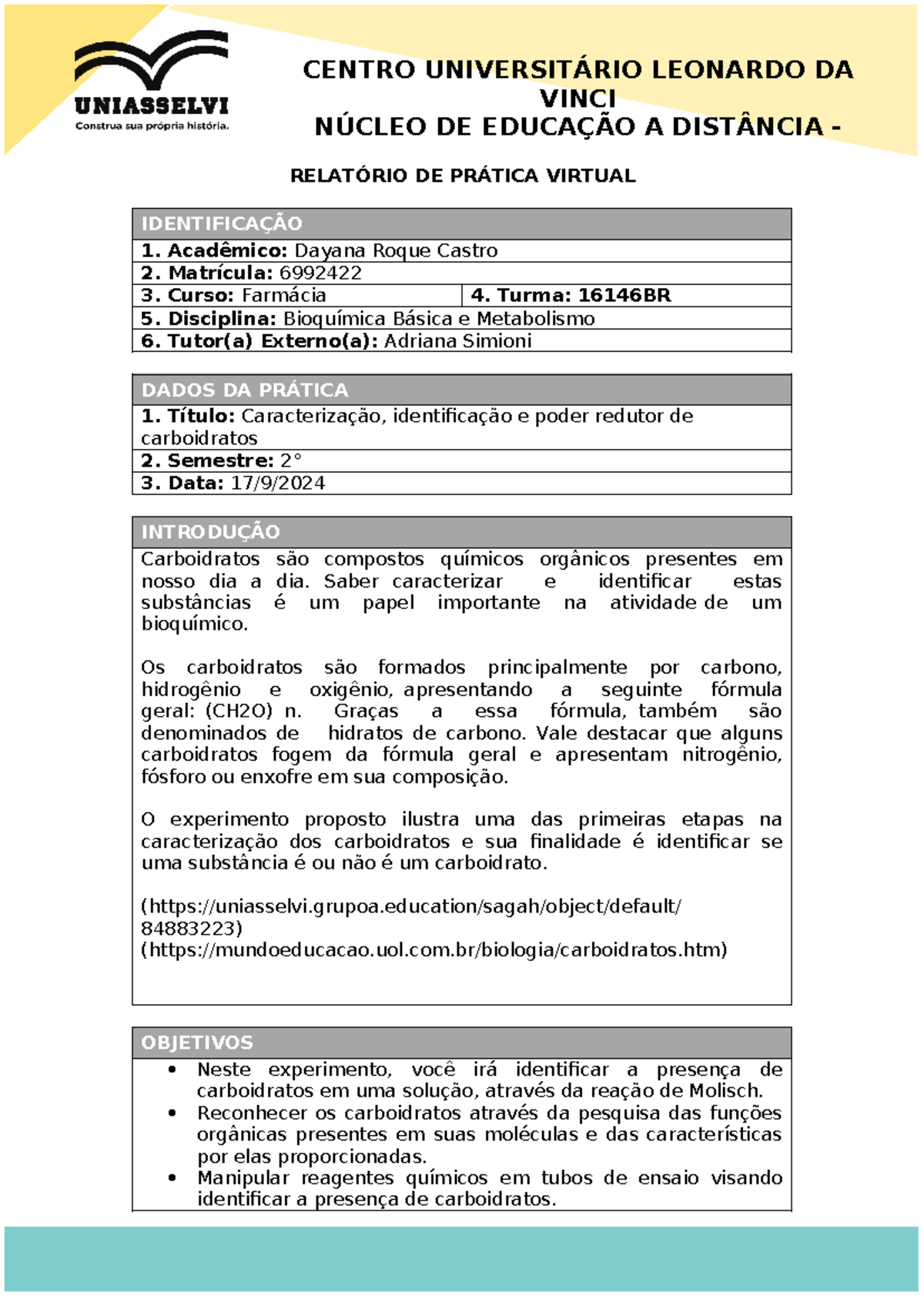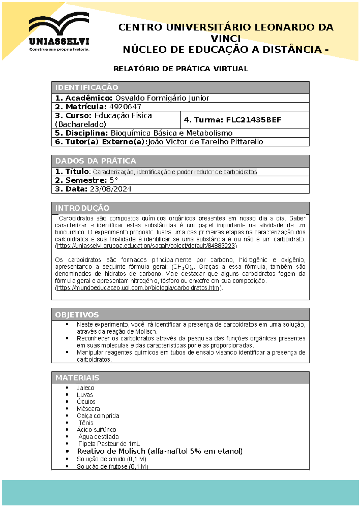 Caracterização Identificação E Poder Redutor De Carboidratos