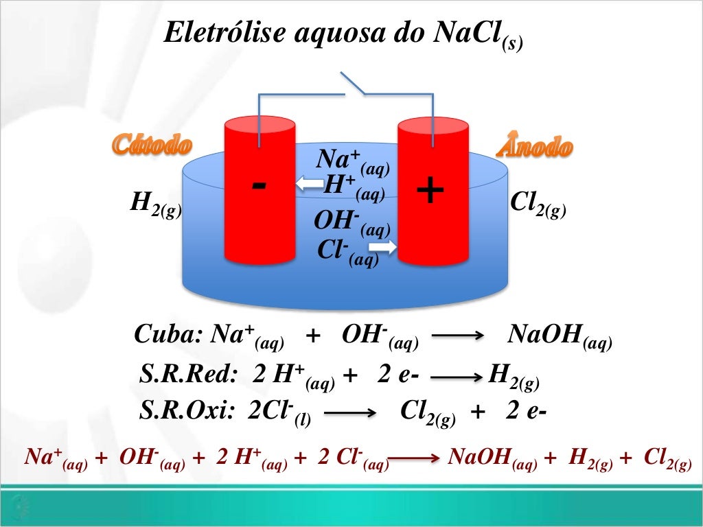 Nos anodos positivos, os íons Cl- perdem elétrons e se transformam em átomos de cloro, que se unem para formar gás cloro. A água presente na solução também é decomposta em hidrogênio molecular (H2) e oxigénio molecular (O2) através de uma reação chamada decomposição da água.