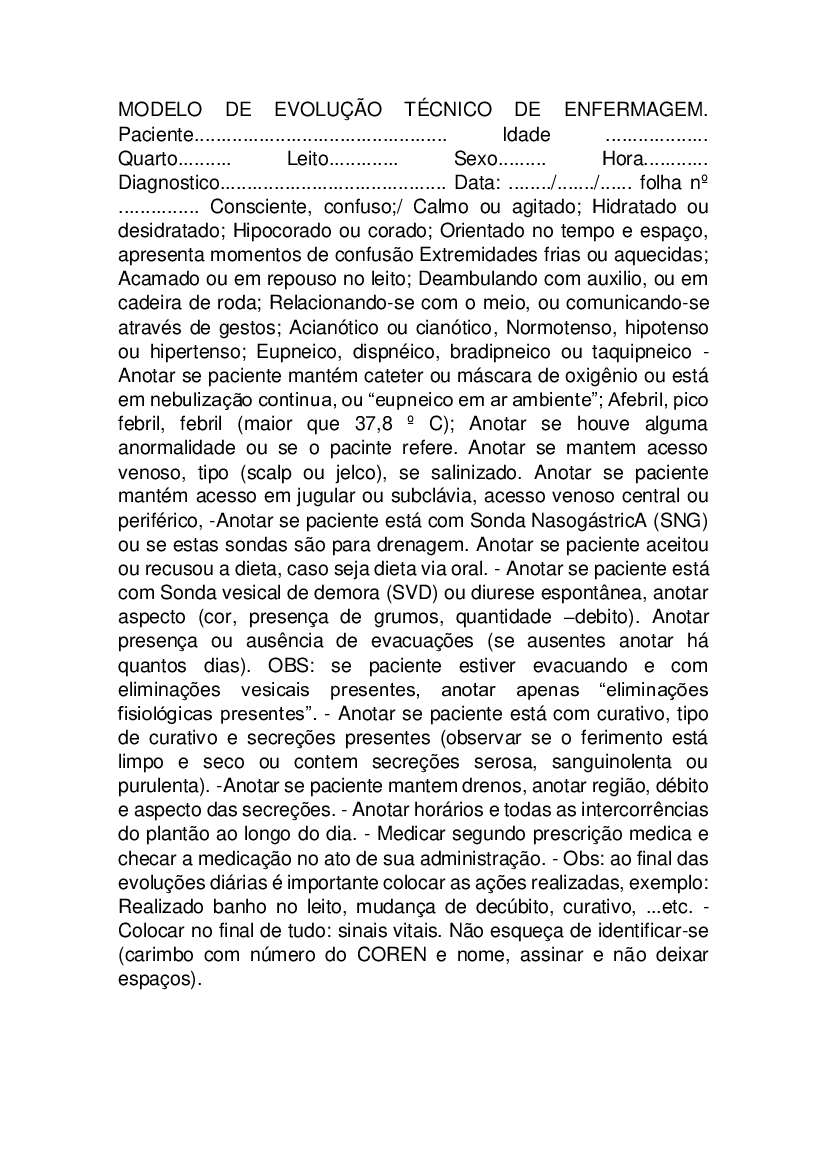 Evolução De Enfermagem Modelo