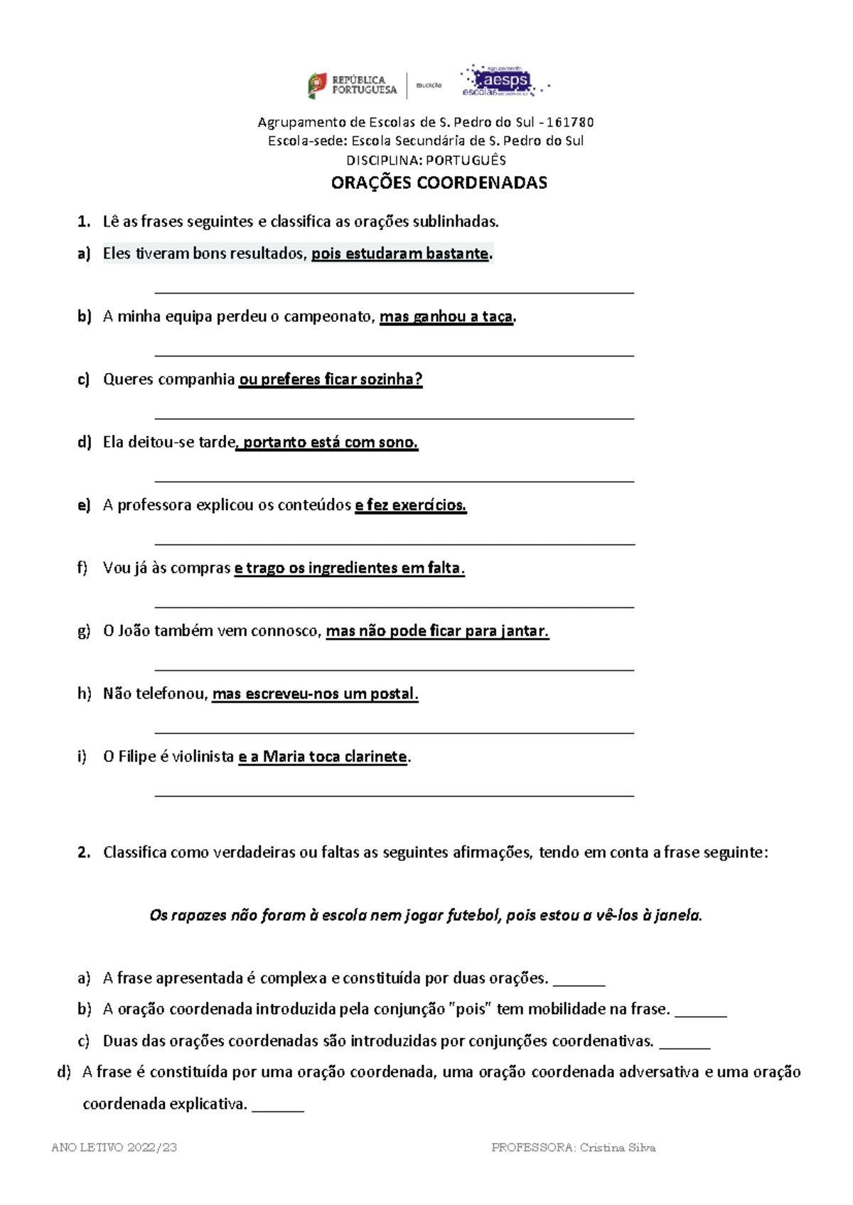 Alguns exercícios comuns sobre orações coordenadas focam na identificação da conjunção que liga as proposições. Exemplos: