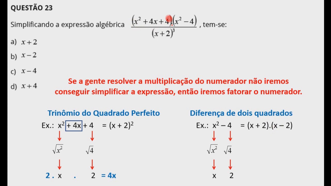 Fatoração por diferença de quadrados: Esta técnica é aplicável a expressões da forma a² - b², onde 'a' e 'b' são expressões algébricas. A fórmula utilizada neste caso é a diferença de quadrados: a² - b² = (a + b)(a - b)