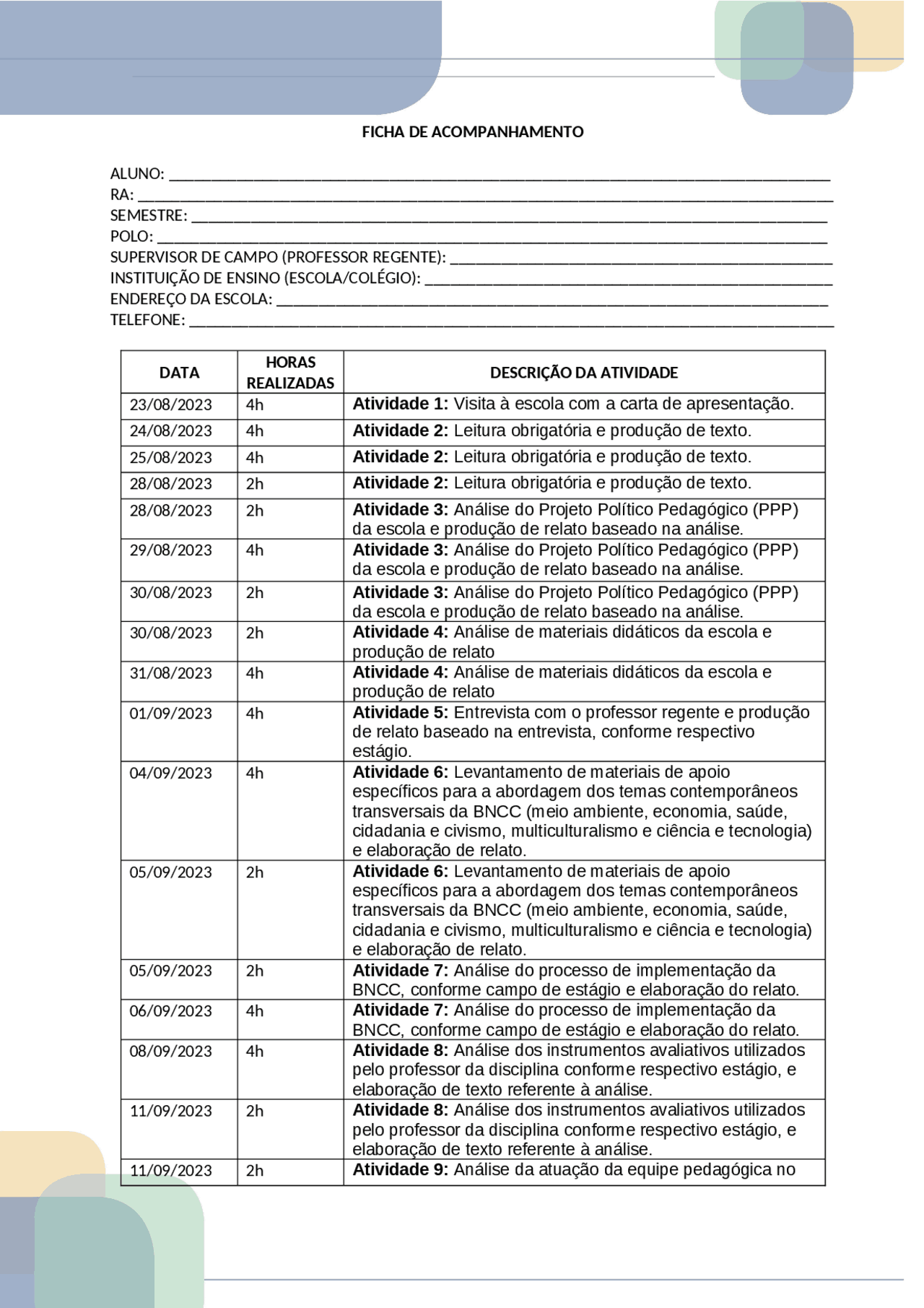 Ficha de acompanhamento de estágio - Pedagogia