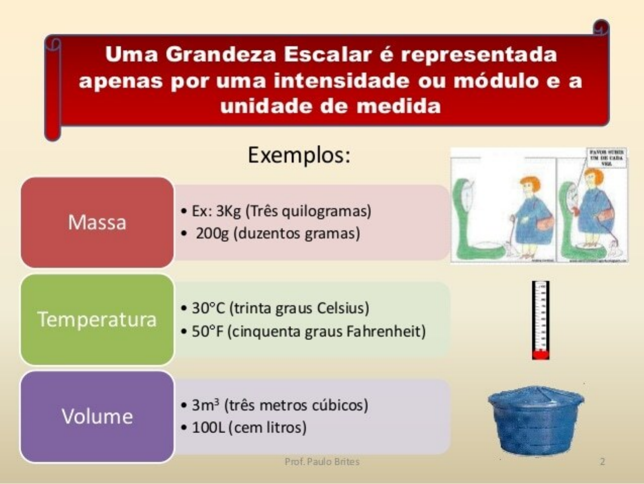 Grandezas escalares são aquelas que são completamente definidas por um valor numérico e uma unidade de medida. Ou seja, para descrevê-las, precisamos apenas saber seu valor absoluto. Exemplos de grandezas escalares incluem: temperatura, massa, tempo, velocidade escalar (modulo da velocidade), energia, etc.