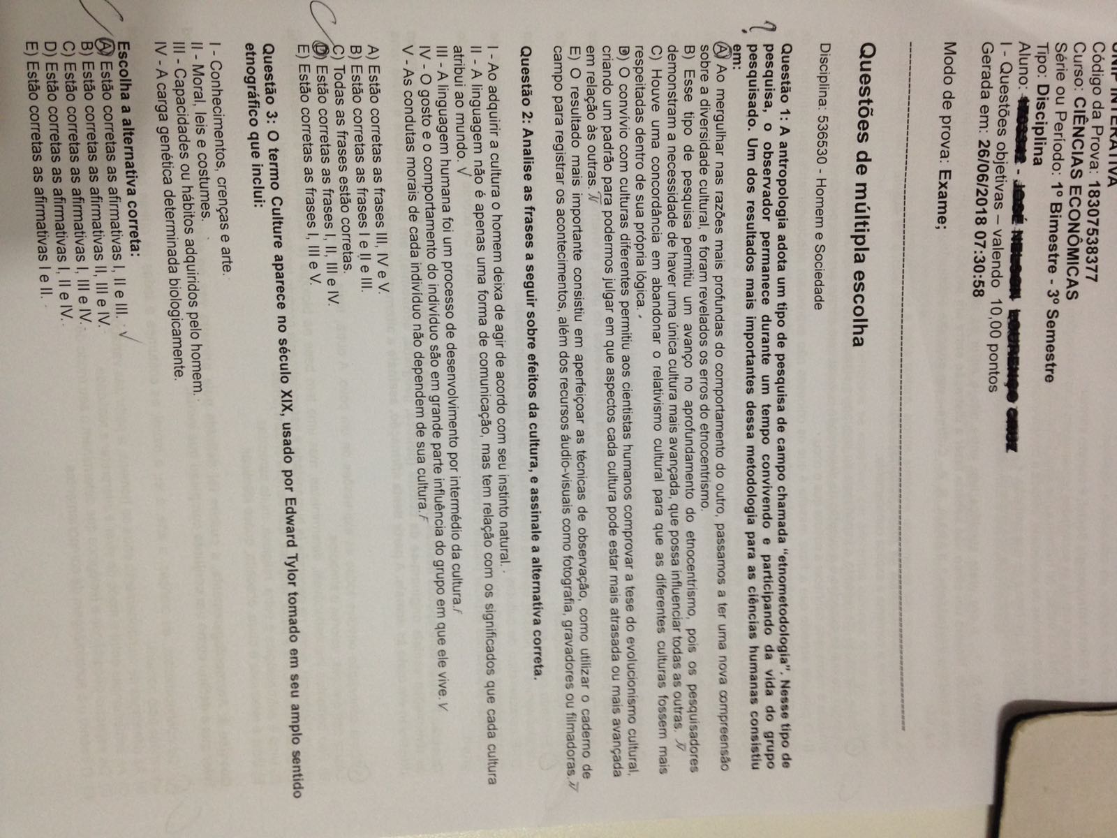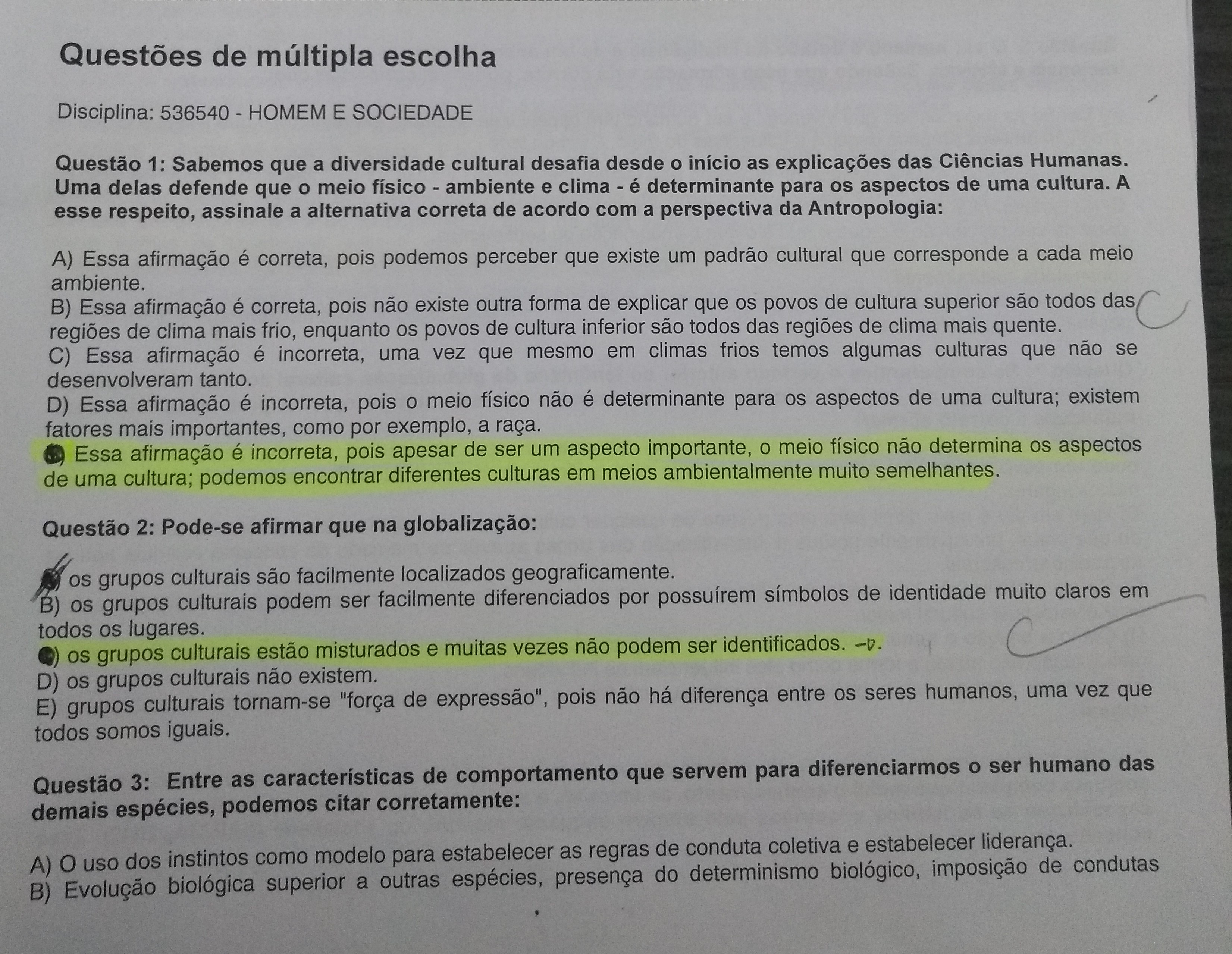 Prova Homem e Sociedade Unip - Homem e Sociedade
