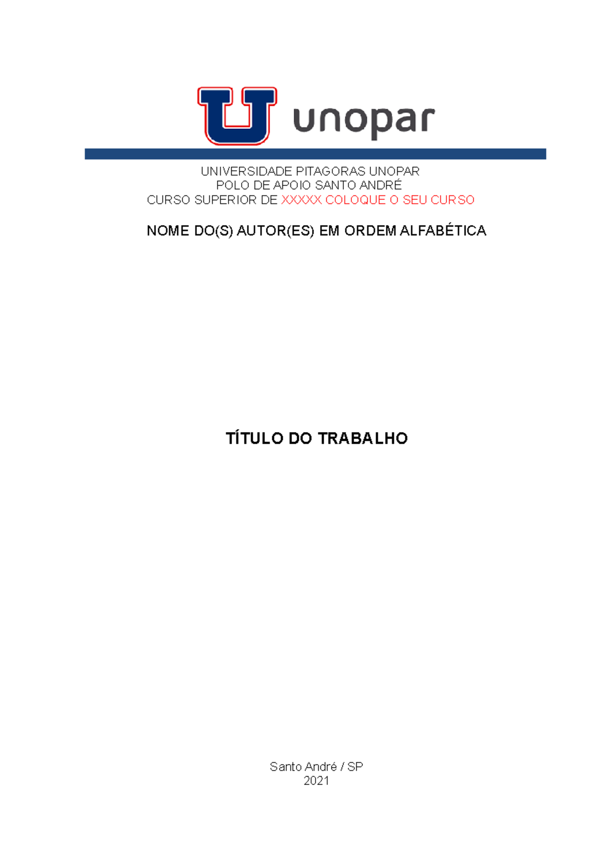 Além disso, o logo da Unopar também contribui para a promoção da marca da instituição. A cada capa de trabalho distribuída, o símbolo se torna visível para um novo público, expandindo o alcance da Unopar e fortalecendo sua imagem. Essa visibilidade pode ser especialmente relevante para trabalhos apresentados em eventos acadêmicos, concursos ou outras ocasiões que envolvam um público externo à universidade.