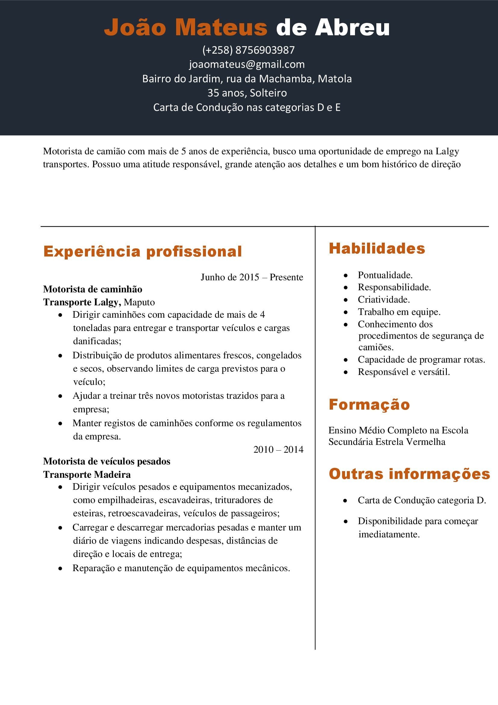 A seção de qualificações é onde você menciona seus certificados, cursos e licenças de motorista. Inclua a categoria da sua CNH, validade dos seus documentos e quaisquer treinamentos específicos que você tenha realizado, como direção defensiva, primeiros socorros ou segurança carga.