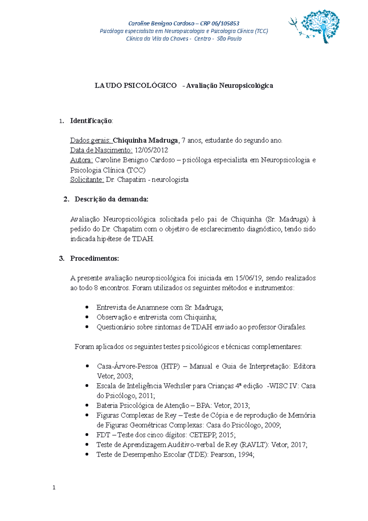 A autoria e a responsabilidade pelo conteúdo do laudo são unicamente do psicólogo que realizou a avaliação.