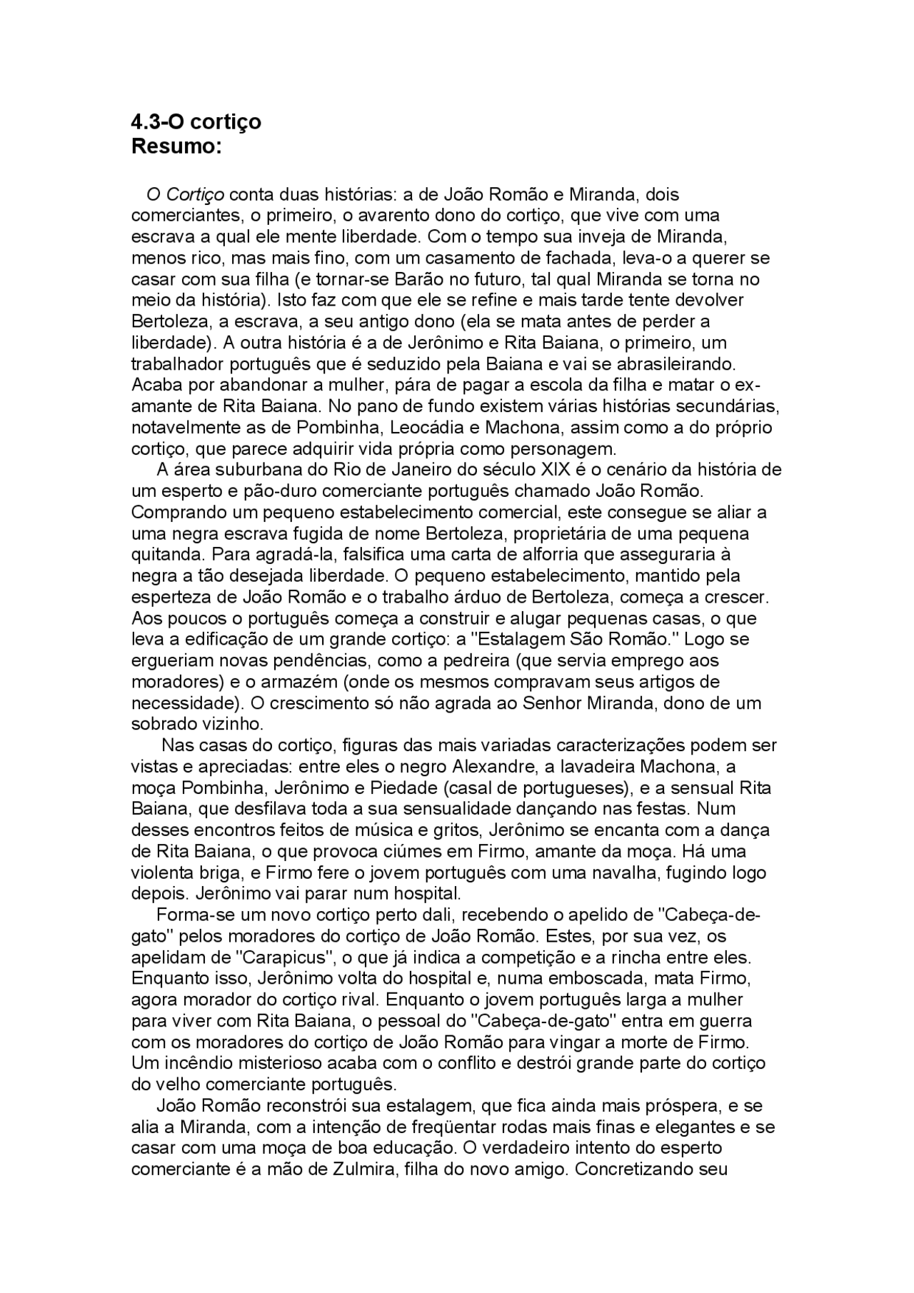 O Cortiço Resumo Pequeno