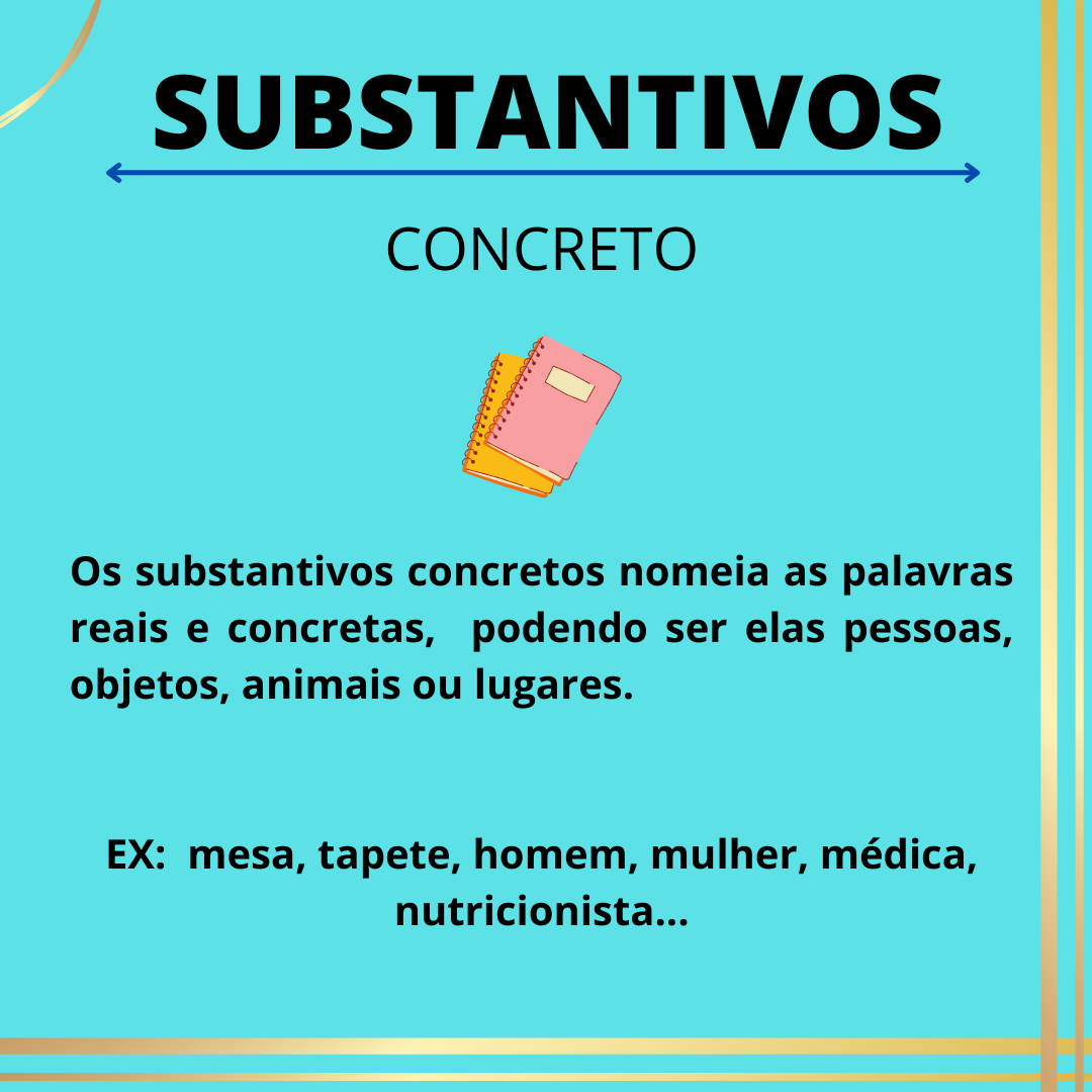 Um substantivo é uma palavra que nomeia seres, coisas, lugares ou ideias. Podemos classificá-los em dois tipos: concretos e abstratos.