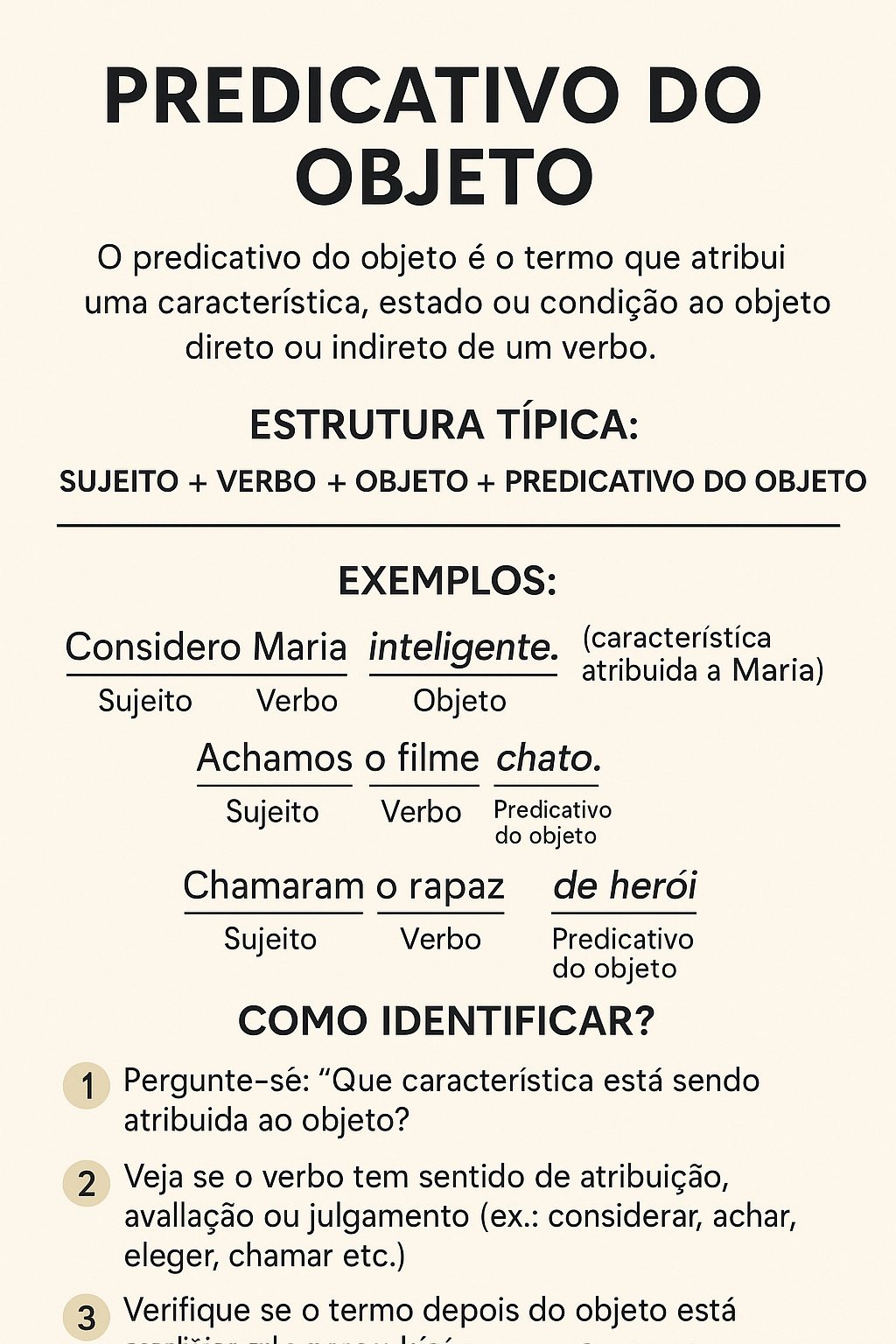 A identificação do predicativo do objeto pode ser facilitada pela observação de uma série de características: ele geralmente é um adjetivo funcionando como substantivo, ele complementa informações sobre o objeto direto, e está situado após o objeto direto.
