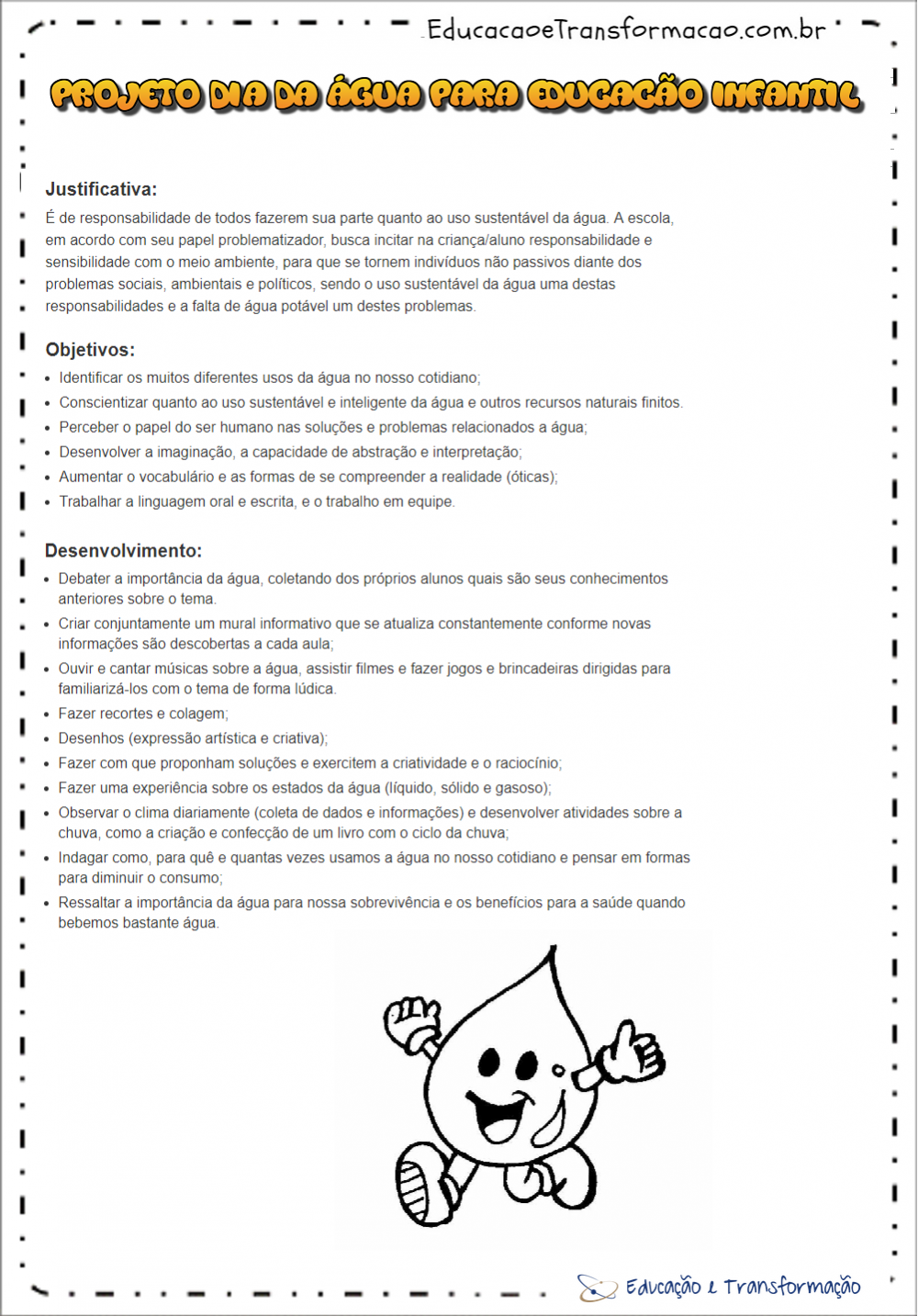 O “Projeto Dia da Água Educação Infantil” é uma iniciativa essencial para conscientizar as futuras gerações sobre a importância da água para a vida e para o planeta. A água é um recurso natural vital que sustenta a vida, mas muitas vezes é tratada como algo abundante e disponível o tempo todo. É fundamental desde cedo educar as crianças sobre o ciclo da água, suas propriedades e o impacto do uso consciente ou irresponsável.