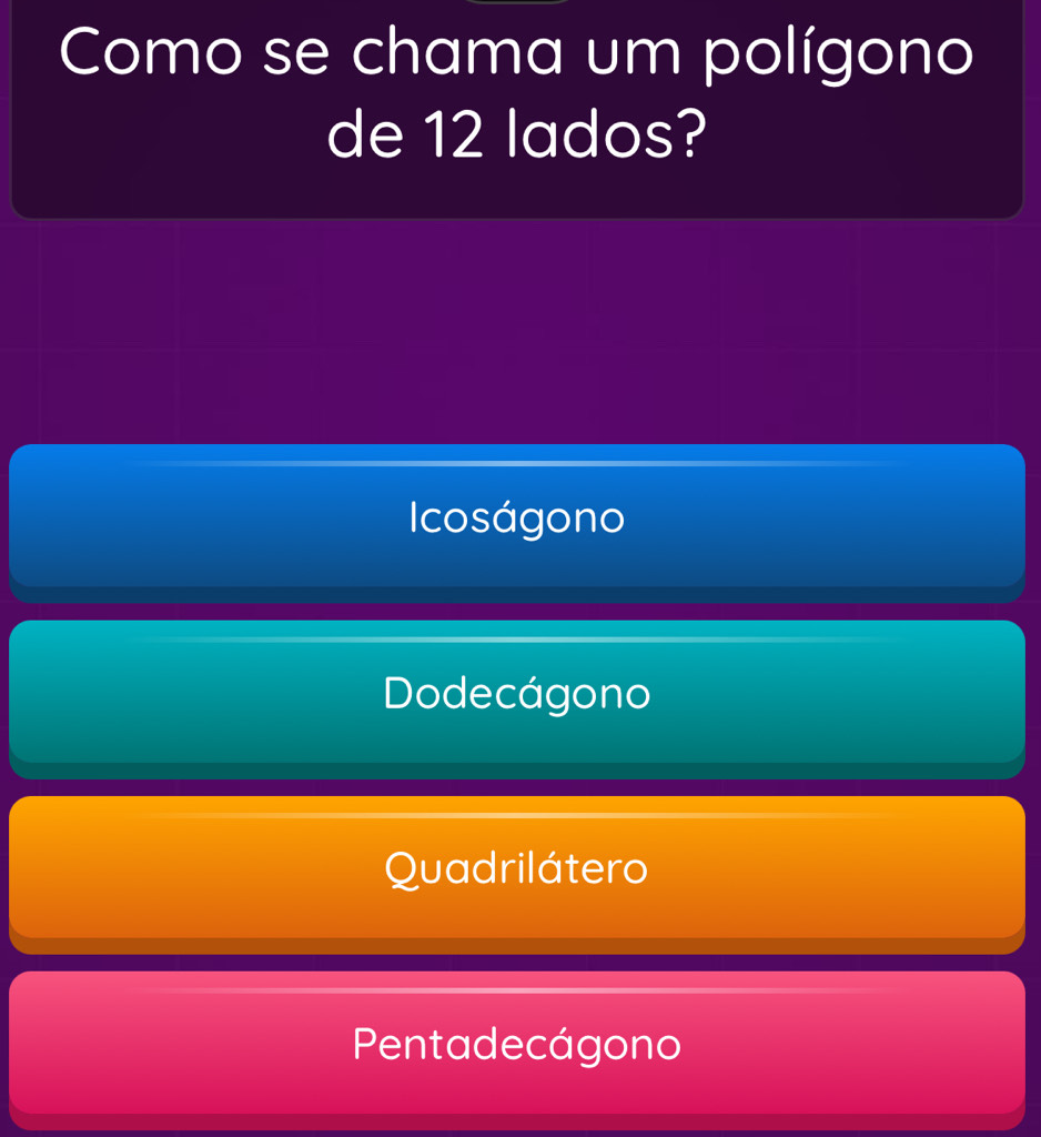 Resolvido:Como se chama um polígono de 12 lados? Icoságono Dodecágono ...