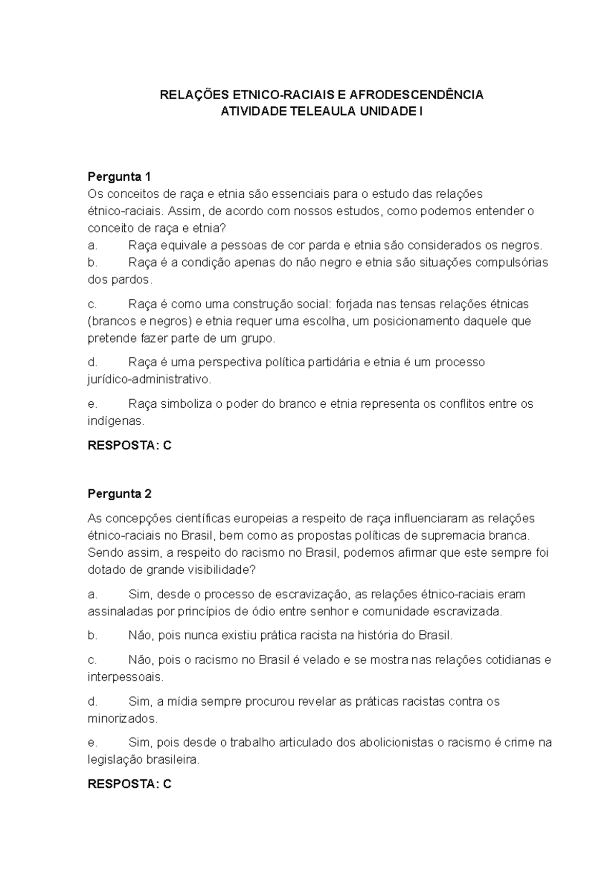 Relações étnico Raciais E Afrodescendência Unip Respostas Questionário 1