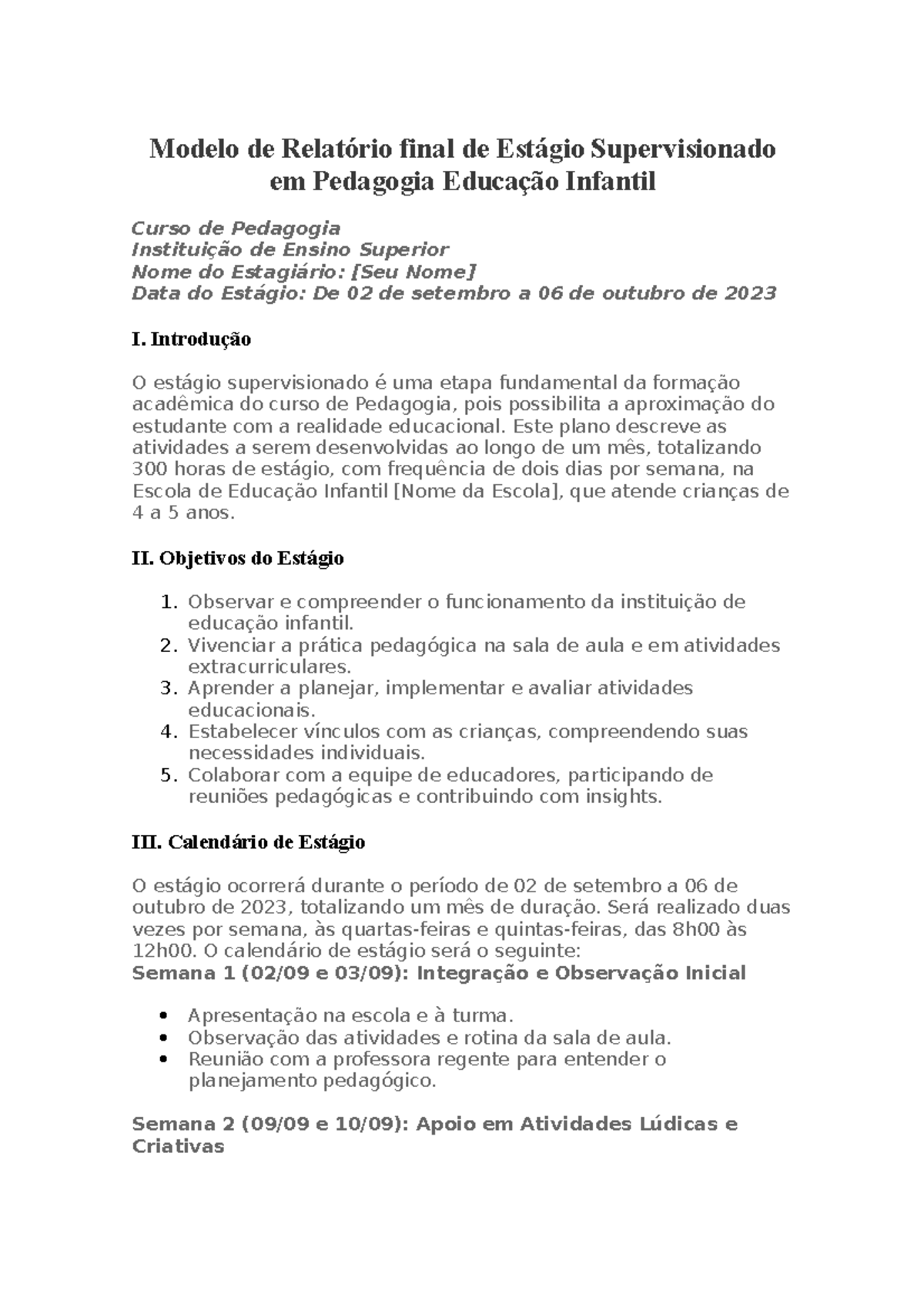 Modelo De Relatorio De Estagio Pedagogia