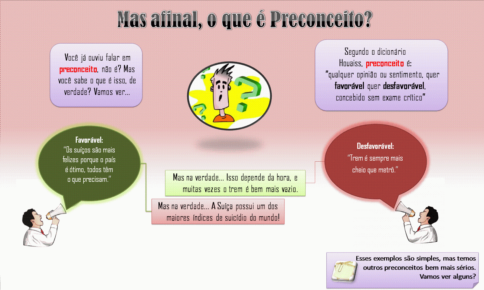 O preconceito pode ser direcionado a diversas características, como raça, religião, gênero, orientação sexual, idade, origem social, aparência física e muitas outras. Essa forma de discriminação se instala em nossas mentes através de experiências pessoais, influências sociais e culturais, e perpetuação de informações distorcidas e preconcebidas.