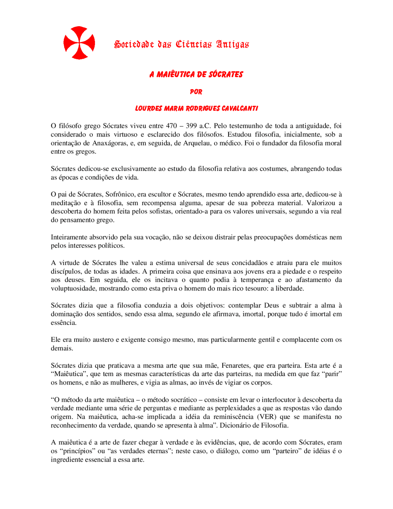Maieutica de Socrates - Sociedade das Ciências Antigas - Maieutica de