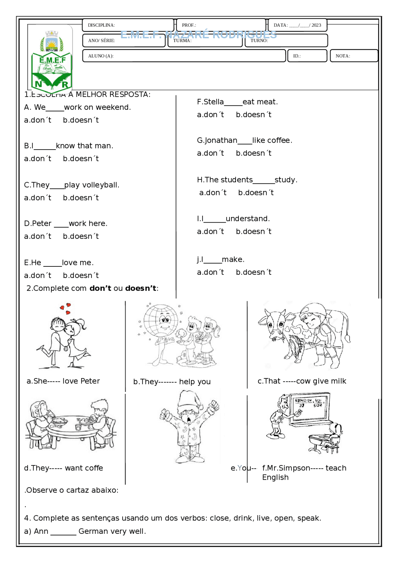 ATIVIDADES SOBRE TEMPOS VERBAIS | Exercícios Inglês | Docsity