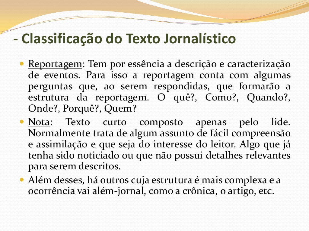 Existem diferentes tipos de texto jornalístico, cada um adaptado a um propósito específico.
