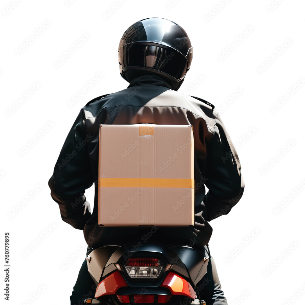 Entregador numa moto visto de costas entregando uma caixa de papelão