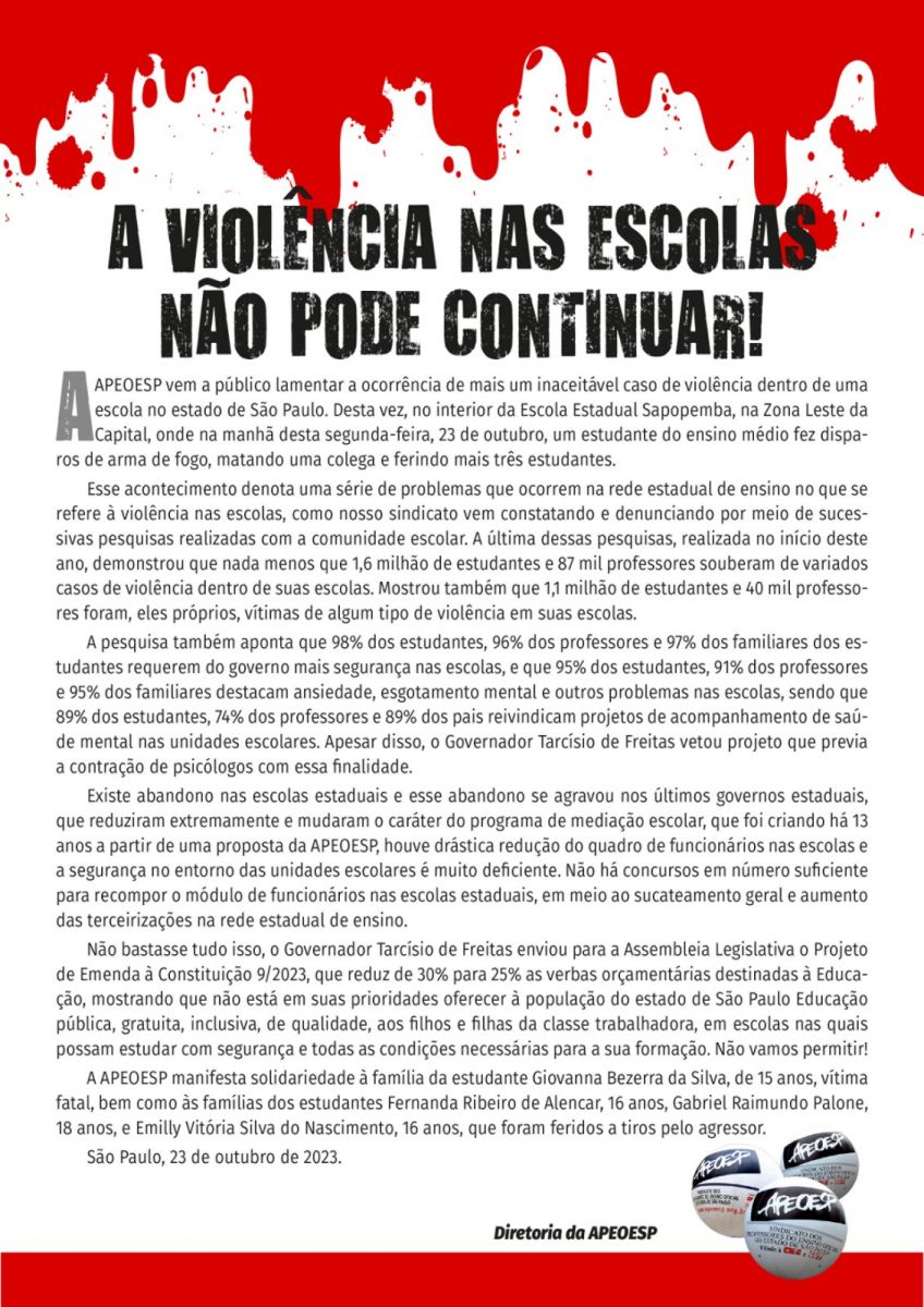 APEOESP - A VIOLÊNCIA NAS ESCOLAS NÃO PODE CONTINUAR